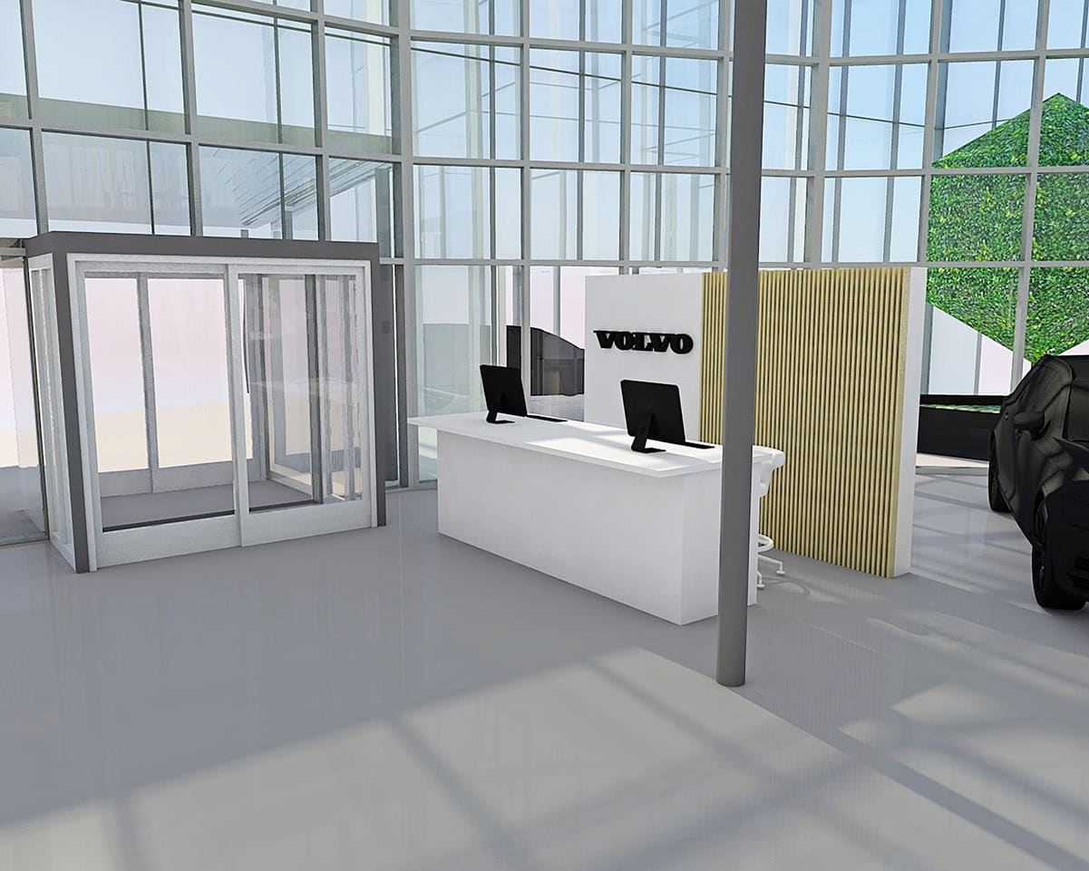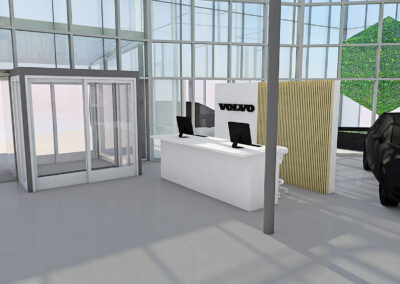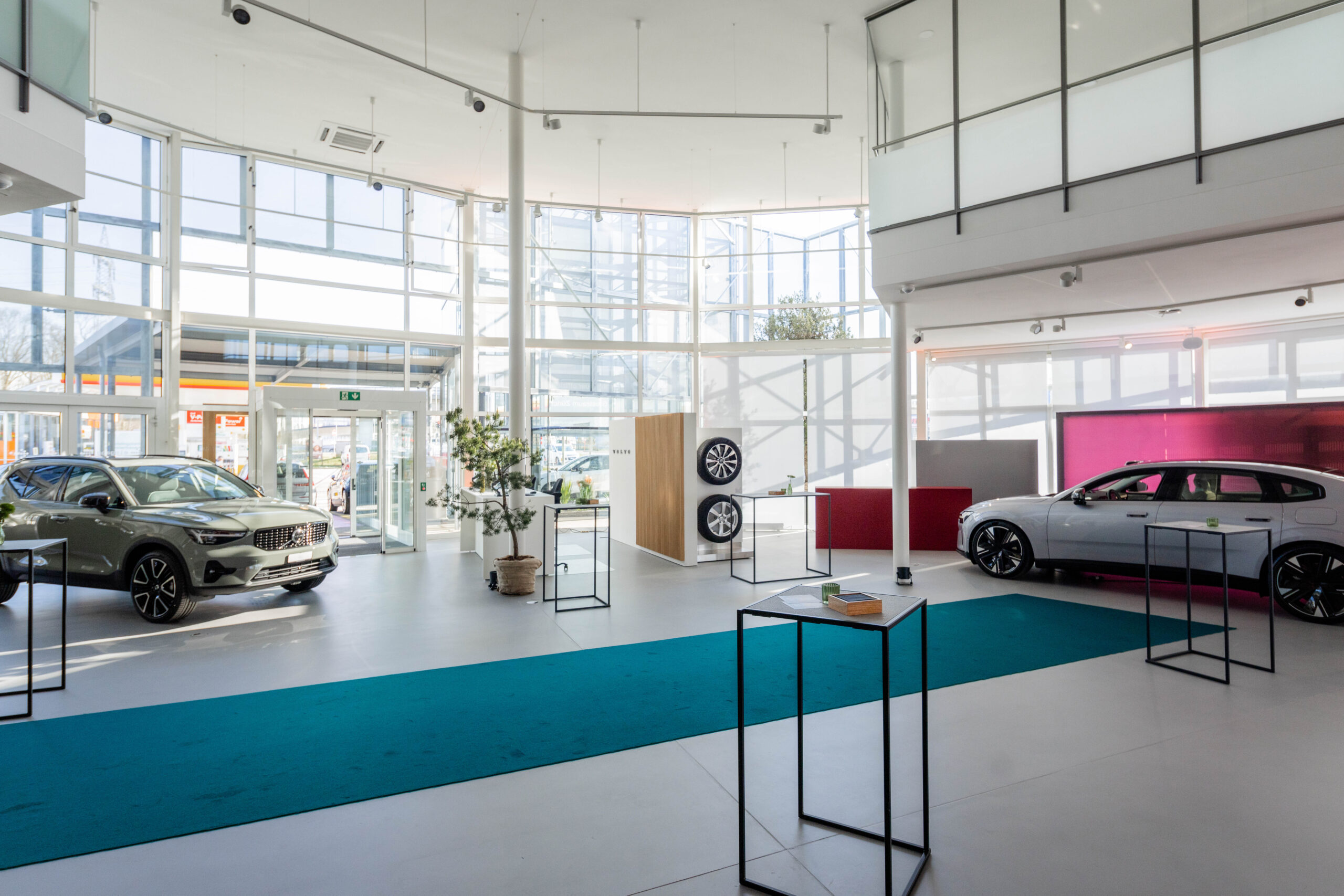 Der Showroom, ehemals auf die Marke Smart ausgelegt, wurde komplett überarbeitet und konsequent auf die Markenidentität von Volvo umgestaltet. Der Fokus lag dabei stets auf Nachhaltigkeit: Bestehende Strukturen wurden soweit wie möglich erhalten und in das neue Konzept integriert.