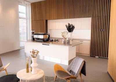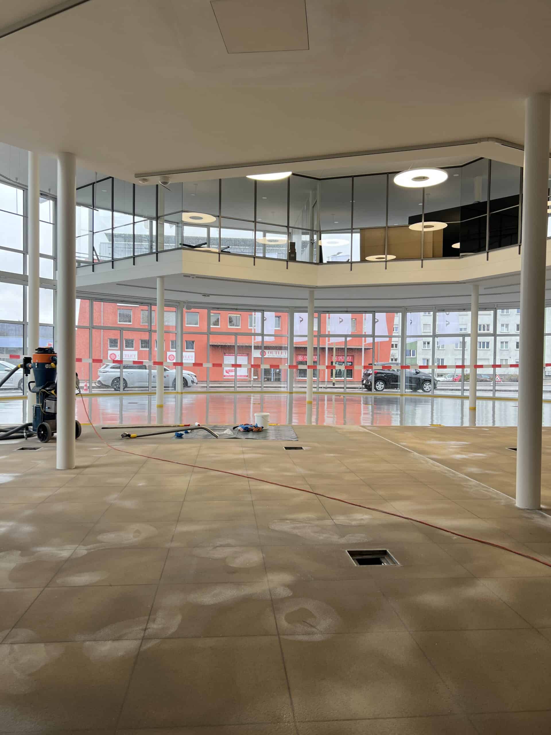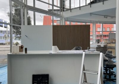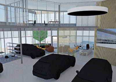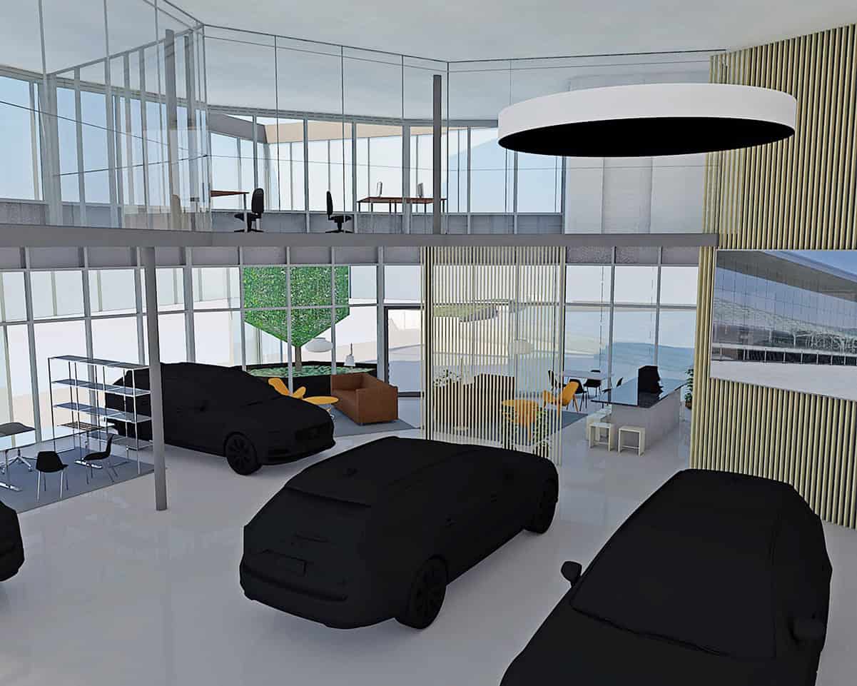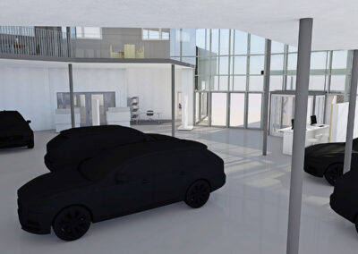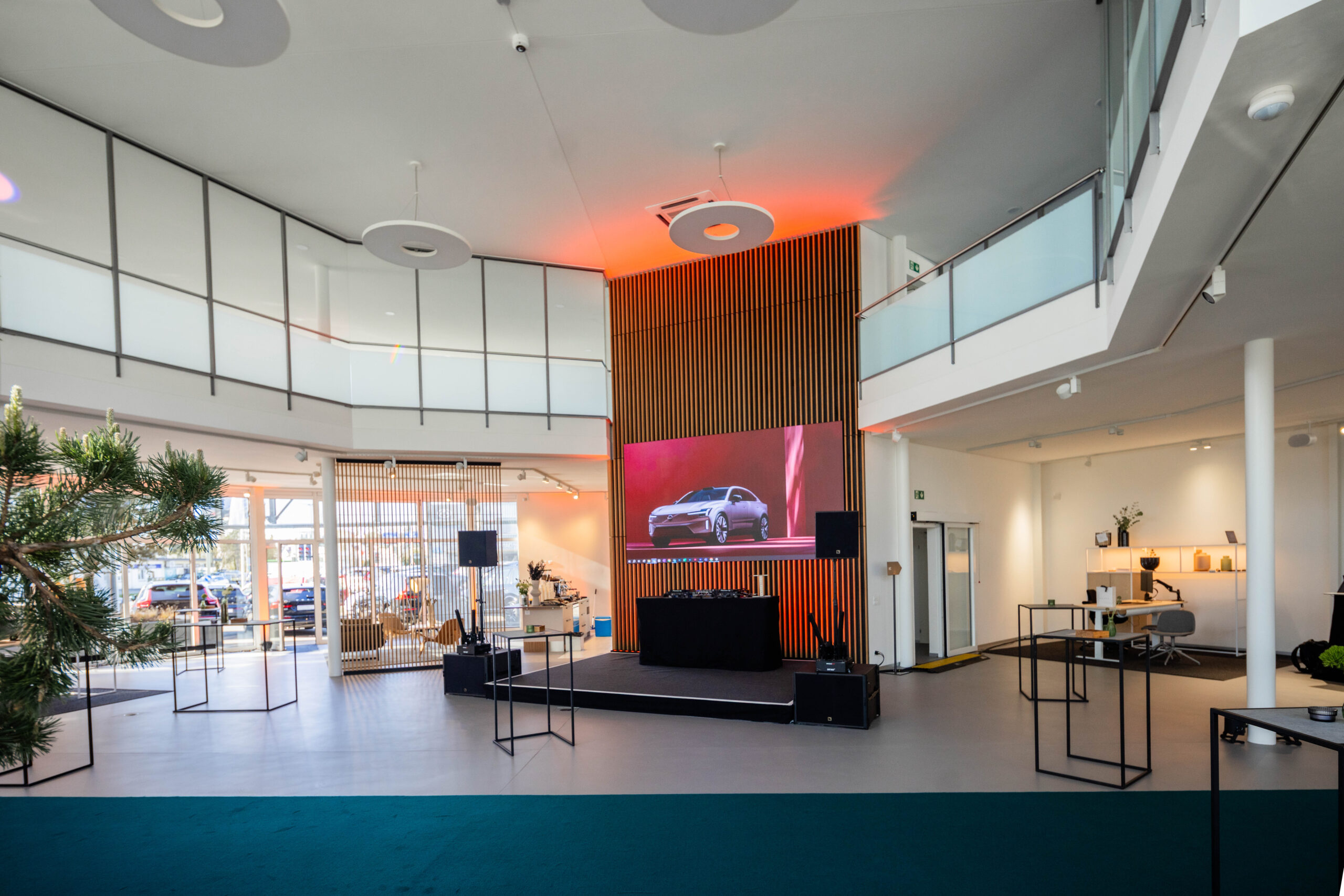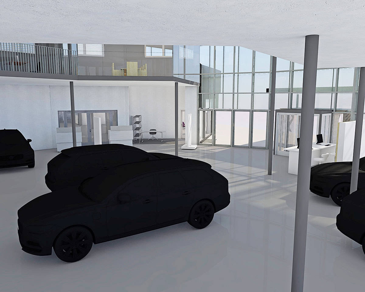 Entstanden ist ein einzigartiger, repräsentativer Raum, der sich über zwei Etagen erstreckt. Im Obergeschoss befinden sich moderne Büro- und Mitarbeiterräume. Das Erdgeschoss empfängt Kundinnen und Kunden mit einem stilvollen Ambiente, frischem Kaffee und dem Blick auf die neuesten Volvo-Modelle.