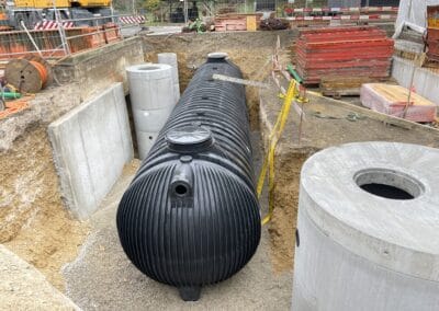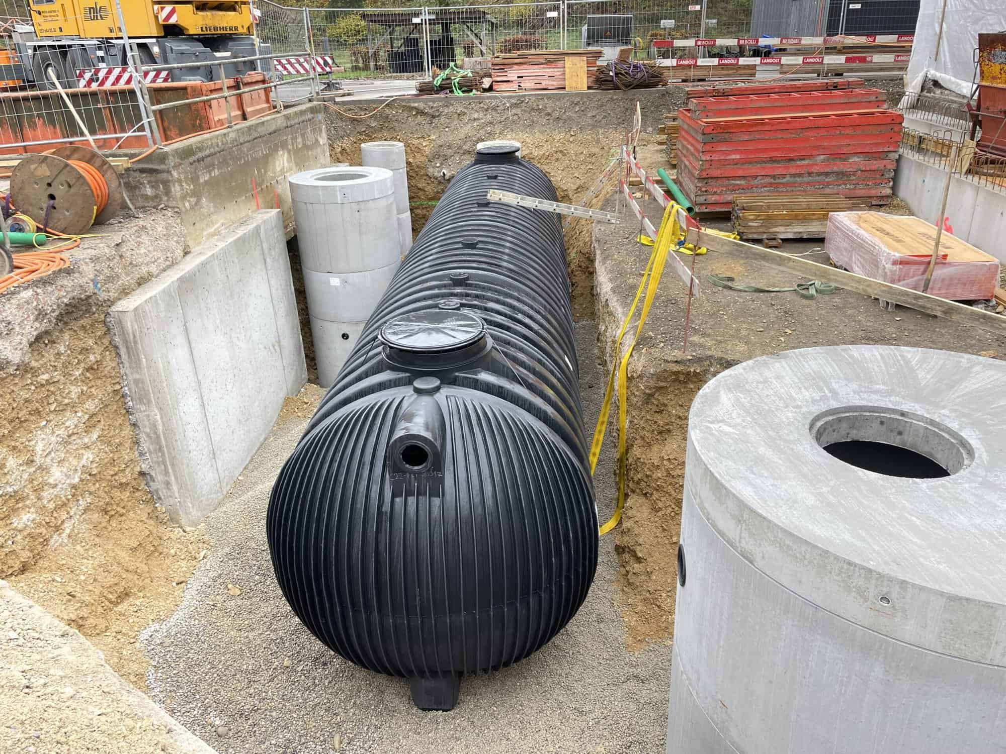 Um das vorhandene Dachwasser für die Reinigung zu nutzen, wurde ein 55m3-Tank in den Boden eingelassen. So kann das Meteorwasser für den Waschvorgang verwendet werden. Das gebrauchte Wasser wird mittels Emulsionsanlage aufbereitet und in die Schmutzwasserkanalisation eingeleitet.